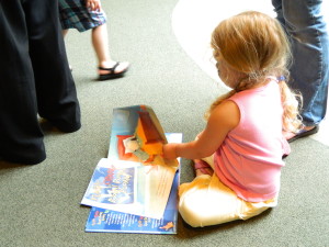 calls and the kids line up and chug chug chug into the storytime room. After stories – she might have to rearrange the room for a teen group (as she did today) … and then back to checking book in and out — but she clearly loves her job. And I love librarians like her!